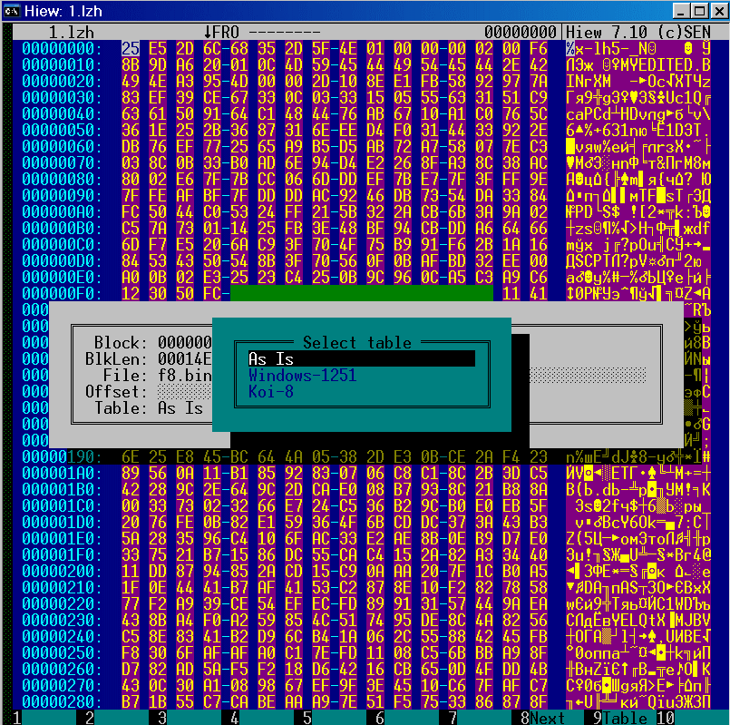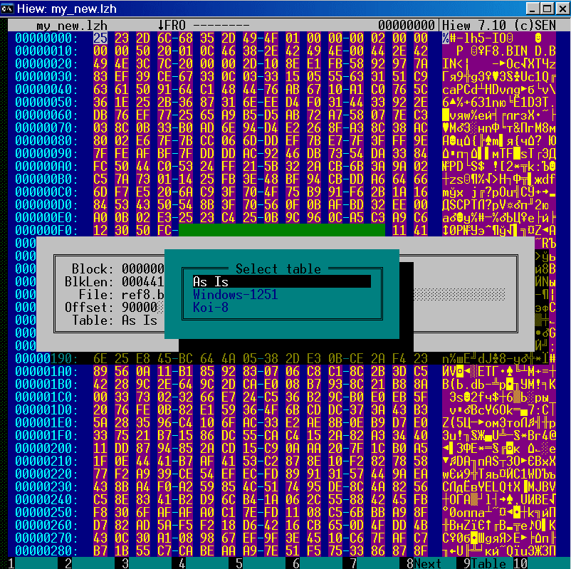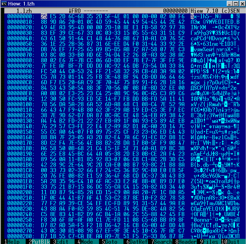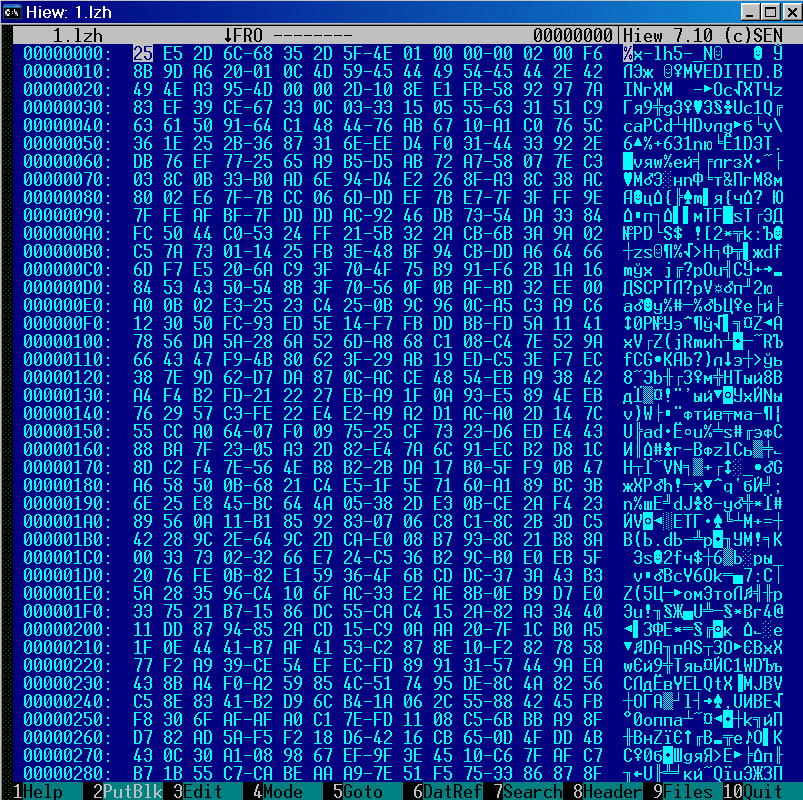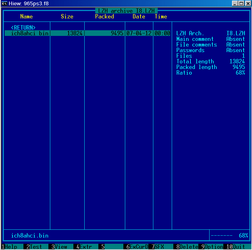Второй вариант - "ручками". Ищем в hex-редакторе по символьной строке '-lh' начало и конец нужного модуля, сохраняем найденную область в файл с расширением '*.lzh' и после распаковываем любым архиватором. Например, для распаковки "ICH8AHCI.BIN" последовательно перебираем найденные строчки '-lh', пока не доберемся до нужной:
