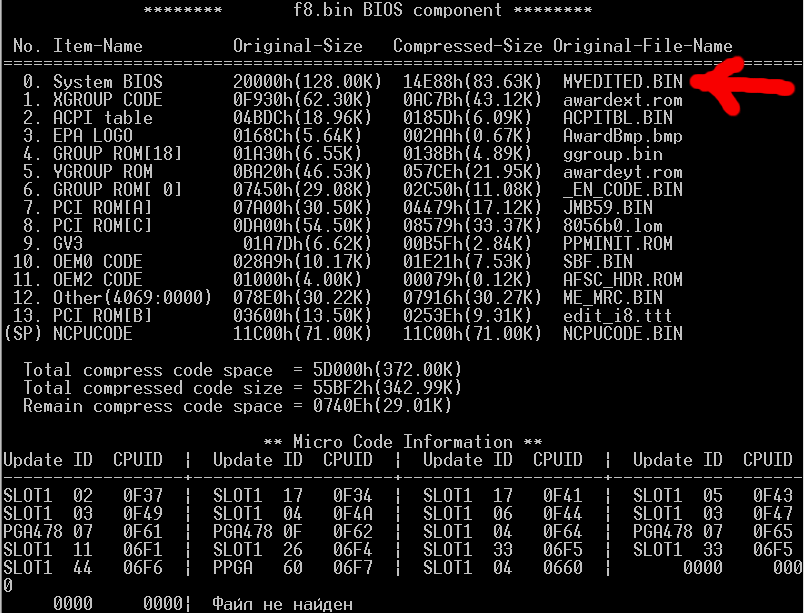 Вариантов добавления новой (отредактированной) версии "original.bin" в биос также есть несколько и эти варианты во многом аналогичны его распаковке с их недостатками. Потому не будем отвлекаться на "мишуру" и постараемся сделать максимально "правильно".