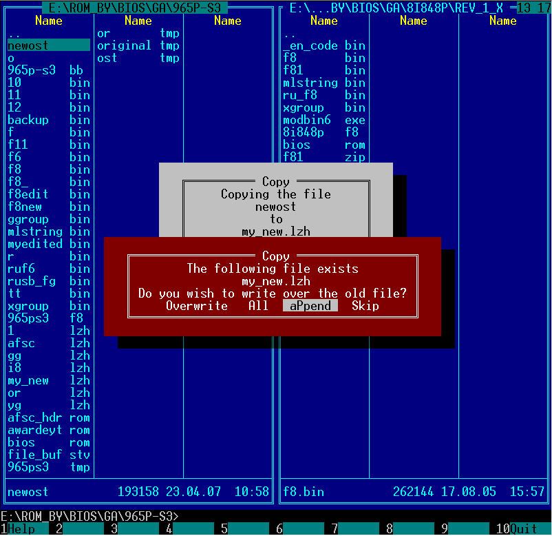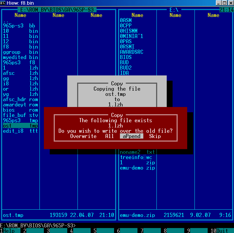 Далее следует "хитрая" процедура - копируем в конец ранее созданного "1.lzh" полученный "хвост" биоса ("ost.tmp" - состоящий из всех упакованных модулей кроме "original.tmp").