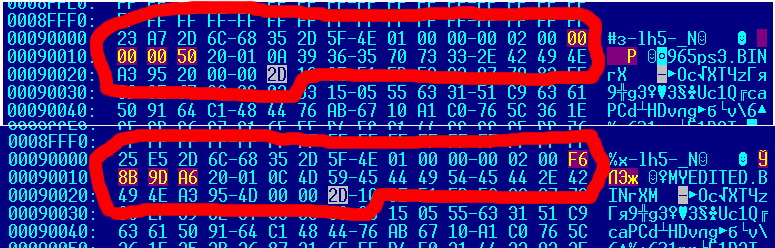 Обведены заголовки и выделено главное отличие - стандартное для "оригинал.бина" место распаковки (5000:0000) в "lha"-шном заголовке обозначает другое, потому имеет совсем другое значение (A69D:8BF6): понятно, что с таким значением биос даже "при желании" - не заработает.