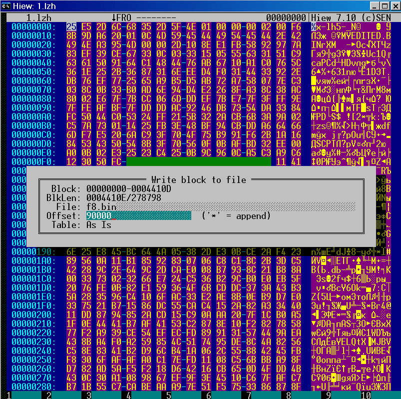 Выделяем всё (CTRL-* в hiew) и записываем в самое начало сделанной "заготовки".