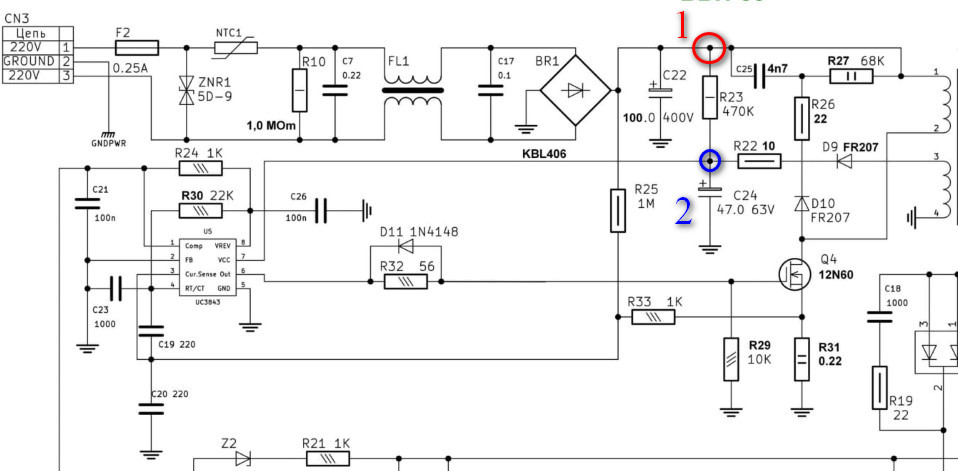 Перепроверил все детали в обвязке UC3842 все исправны (ну или как минимум не в обрыве или коротыше) проверял тестером TC-1 в нем показываются какие либо параметры у той же 12N60 не вдавался в подробности считая что раз определяется значит исправна. Сопротивления в норме, конденсаторы тоже целые. Те что в твердотельной оболочке не выпаивал так как внешне они без каких либо дефектов.
